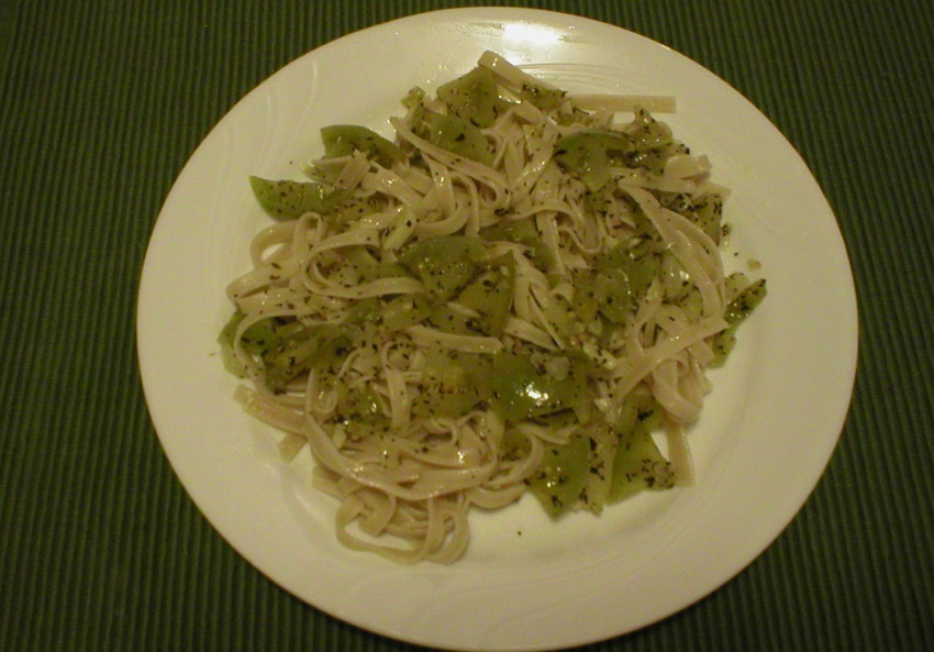 Like many people right now, I have an abundance of green tomatoes on hand from my cleaned up tomato plants. Fried green tomatoes are always good. But, I was wanting something else for a change. I always love pasta dishes, so I got creative with those green goodies. I concocted the following recipe.