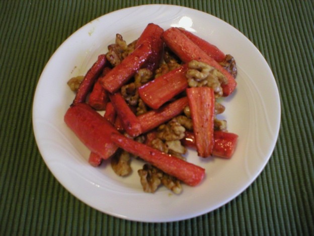 Place pan in middle of preheated oven for 20 minutes. Remove pan and test carrots for tenderness with a fork. When they are almost roasted to your liking, stir in the walnuts. Place back in oven for 5 minutes. Check walnuts for brownness. If they are lightly browned, remove from oven and serve. If the walnuts need more roasting time, return pan to oven for 2 or 3 minutes and check again. Everything is finished when the carrots are fork tender and the walnuts are just lightly browned. Note! Watch walnuts carefully as they can burn quickly. Strive to remove pan from the oven when the walnuts are lightly browned.