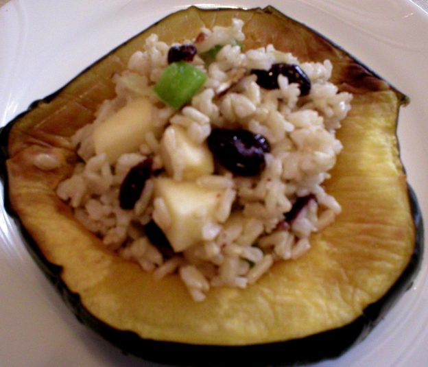 Reheating Note: The squash and/or rice may be cooked ahead of time and held in a covered container in the refrigerator. If doing this, stuff the cold squash with the prepared filling. Place the filled squash halves in a clean, dry baking dish and cover the dish with foil to help retain moisture. Place in oven at either 375F or 400F until heated through. The time will depend upon how cold the squash is and if the rice was also cooked in advance and is still cold.