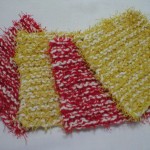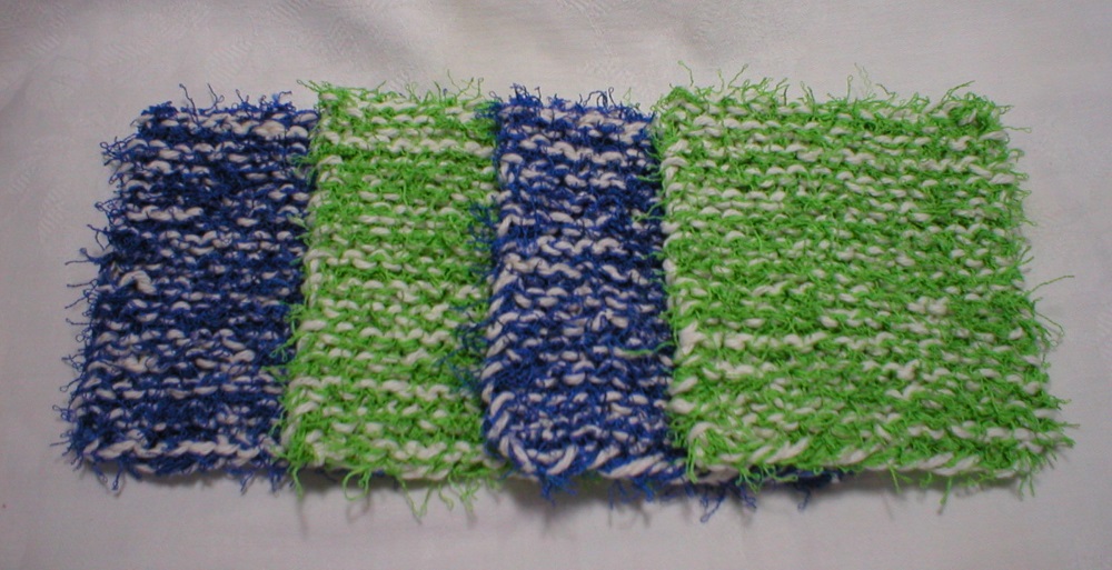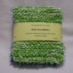 This is REALLY an important point for me. Some brands of cotton yarn lose color readily and that can lead to unhappy customers. So, I tested this yarn for colorfastness. I took small scraps of sage and white yarns and made a small swatch of a cloth (see picture). I didn’t bother cutting off ends nor weaving them in since this was just a test for color fastness. I used the cloth that is pictured in washing dishes numerous times. The sage did NOT bleed at all. If it did, I would have noticed it in the dish water, and also the white yarn would have been stained. As you can see, the white yarn is still white, not a pale green. Hence, I’m VERY please to say that it did not bleed!