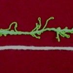 Construction.  This yarn is interesting in itself. It is made of 100% polyester and has a thin central strand with little “extensions” along the strand. The thin central strand appears to be too thin at first, but it actually works well when making a dish scrubby (especially when coupled with one strand of cotton yarn).When looking online at pictures of a skein of this yarn, to me it looks more tangled than a bowl full of angel hair pasta. It’s hard to distinguish one strand of yarn! However, once you get used to it, the yarn is easy to work with. Importantly, I have yet to encounter any tangles at all. In fact, it “flows” easier than most traditional yarns I’ve used. Literally, no knots or tangles. Amazing!