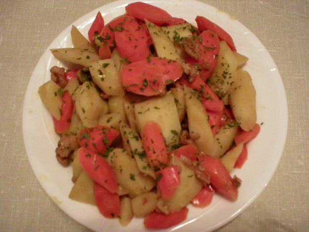 Peel the parsnips and carrots, and cut into bite-size diagonal slices. Cut the carrot slices a little smaller than the parsnip slices, so they will cook at the same rate.
